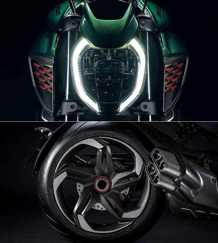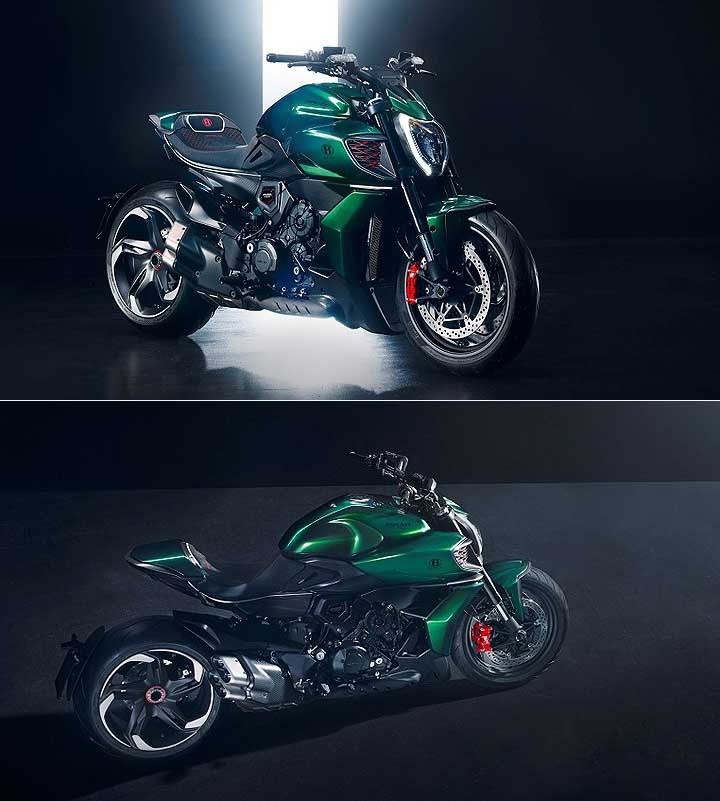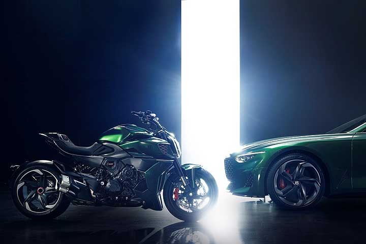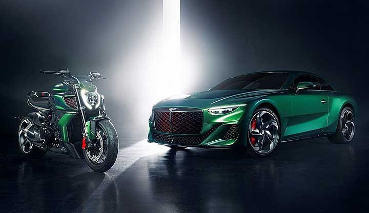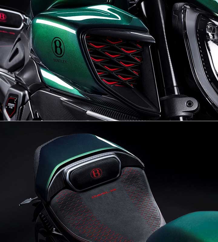 由杜卡迪设计中心与宾利设计部门共同设计的 Diavel for Bentley和 Diavel for BentleyMulliner,拥有与 Batur 相似的流畅车身线条,车色采 Mulliner 客制化部门所提供的 Scarab Green 金属绿涂装 (Diavel for BentleyMulliner 的车色则可选择与车主的宾利相同),设计师们并将 Diavel V4 原有的锋锐线条进行大幅修改,在不同的部位巧妙地融入 Batur 的设计,且换上灵感来自 Batur 所搭载之轮圈的消光黑钛锻造轮圈。