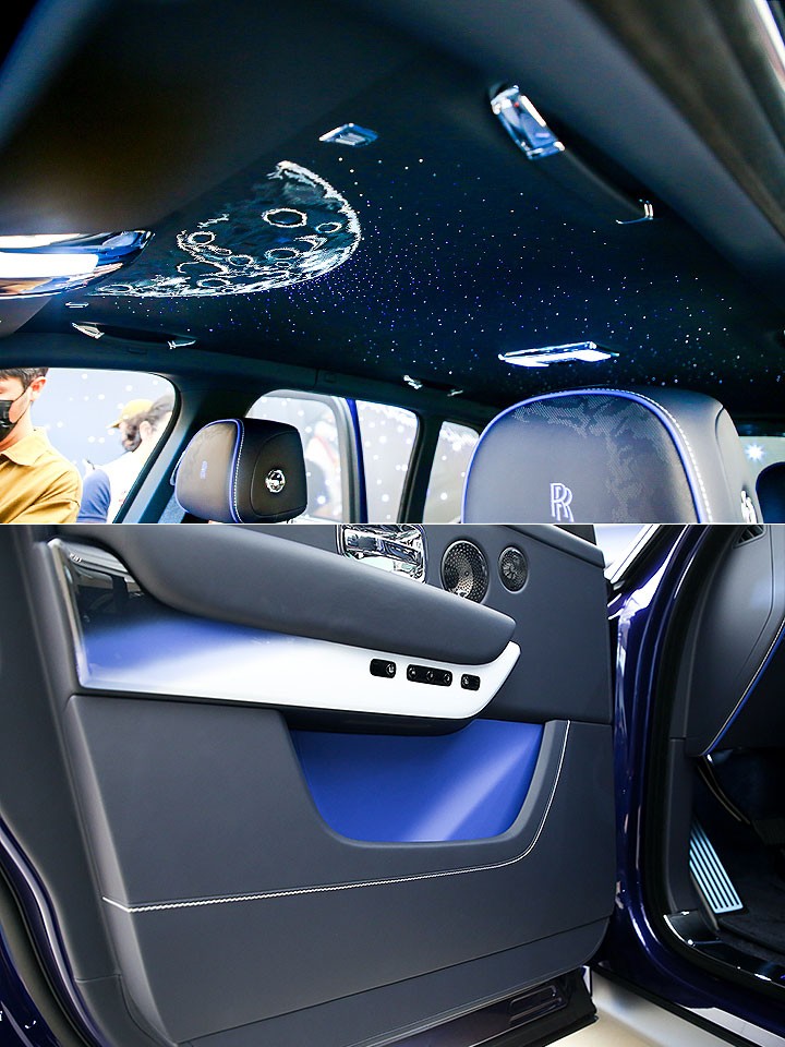 Rolls-Royce 还特别在 Black Badge Cullinan Blue Shadow 的顶篷,以 5 种颜色的绣线、5 种不同的的绣法与 25 万针,手工缝绣了一个遍布陨石坑的月球表面 (光是这个图案就要缝绣两天),并镶进 799 颗白色、384 颗蓝色的光纤「星光 (共 1,183 颗)」,营造出迷人的夜空。