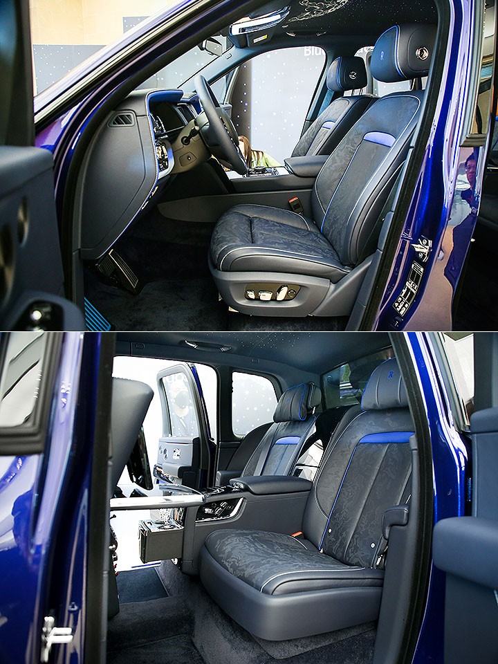 此外,Black Badge Cullinan Blue Shadow 水箱护罩上的「欢庆女神 (Spirit of Ecstasy)」是以钛金属由 3D 打印打造,并在表面薄涂了一层蓝色珍珠漆,且在底座刻有「BLUE SHADOW」和 Black Badge 系列专属的「∞」符号,且搭配半透明漆涂装的轮圈。