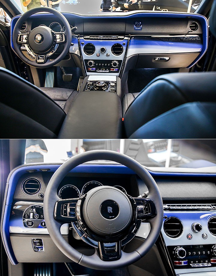 座舱里,Black Badge Cullinan Blue Shadow 则是同样搭载了近似卡门线之颜色、拥有 6 层烤漆 (5 层蓝色与 1 层深黑色) 并具有 3D 效果的中控饰板与车门饰板,且为了增加色彩深度和光泽,表面的透明涂层还含有蓝色和透明玻璃颗粒,玻璃颗粒的含量占比为精确的 0.05%;中控台的中央则可看见外框采浅蓝色阳极处理、底部同样刻有「BLUE SHADOW」的 Bespoke 高级客制化时钟。