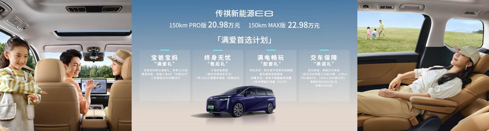 为用户开启满爱的车生活,还离开不传祺新能源E8的诚意政策——“满爱首选计划”。 “满爱首选计划”, 包含“宝爸宝妈‘满爱礼’”、“终身无忧‘售后礼’” 、“满电畅玩‘配套礼’”、“交车保障‘承诺礼’”。特别是“宝爸宝妈‘满爱礼’”,自广州车展发布以来,备受用户欢迎,有94%的客户主动通过APP申请,99%的超高通过率,15分钟内完成审批,更便捷、更高效。
