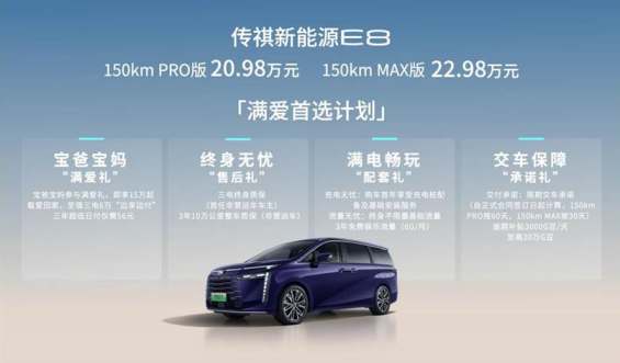 产品实力硬核,20.98万元-22.98万元的价格给力,“满爱首选计划”贴心,可以说,传祺新能源E8就是25万以内家用车最优选,也是家用车3.0时代的最优选。