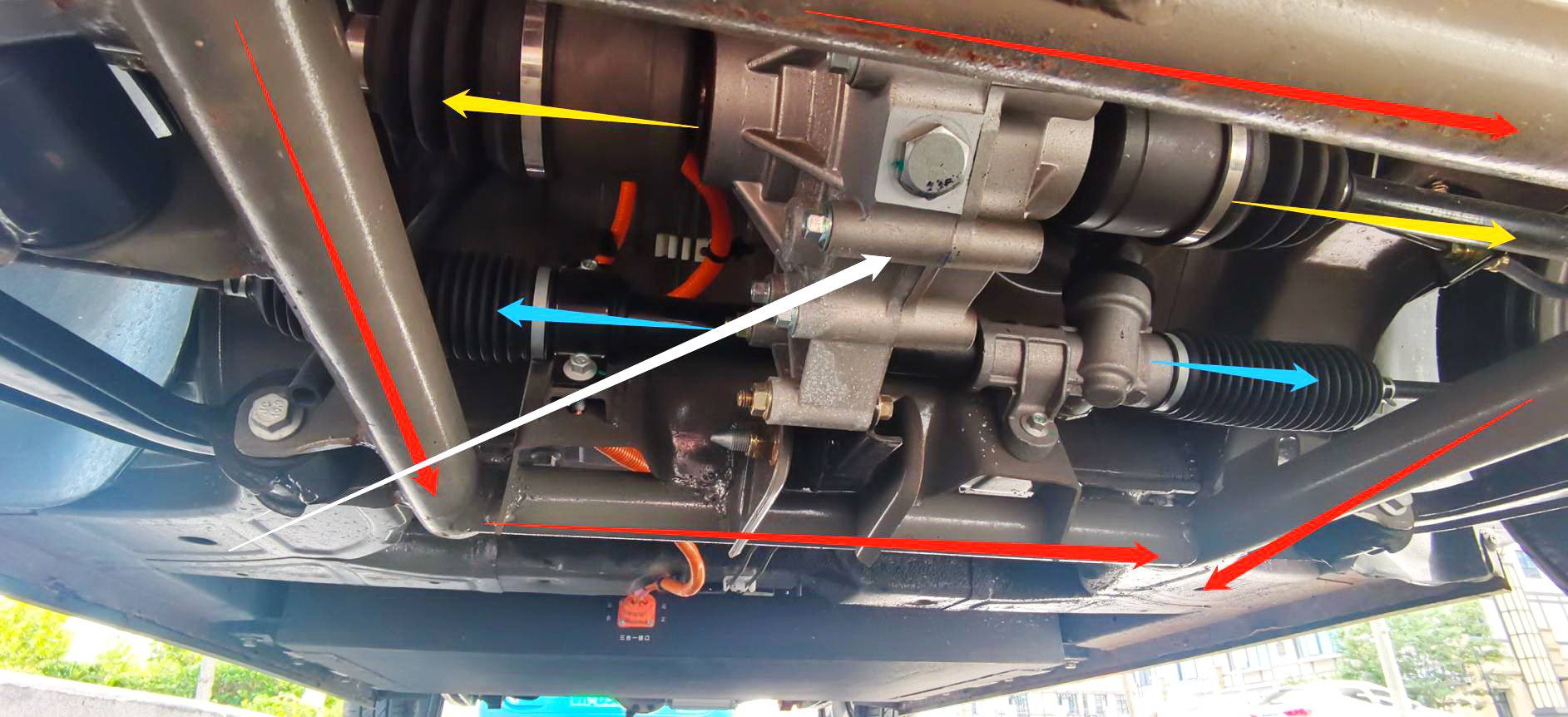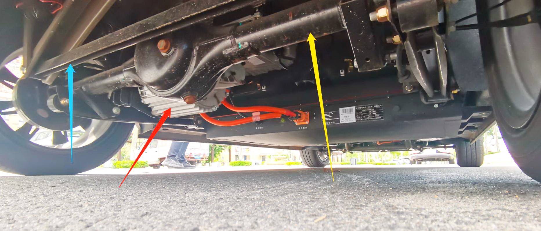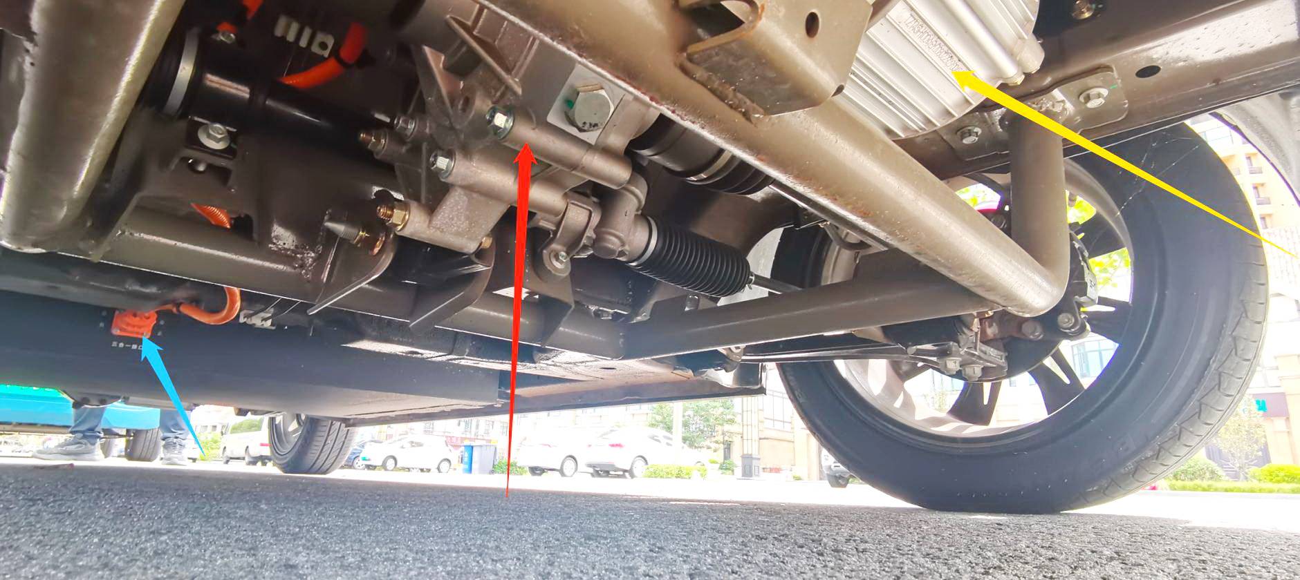 欧麦加EV的车身架构为承载式,前电机、转向机以及其他附属分系统固定在副车架上;后电机与整体桥进行整合;中置的动力电池总成镶嵌在车身焊接下部。