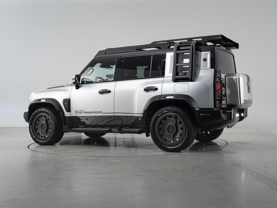 外观造型方面,用了龙颜重装前脸的设计语言,星环式贯穿灯、太空舱门式轮毂、星舰太空银色车衣、多功能车顶平台、两段式侧梯、定制的侧书包以及后置书包,共同组成了这辆在车群中绝不会被忽略的“银龙”,轮胎是255/50 20寸的全地形胎,雪地泥地沙漠都不惧,全车有40多个拓展接口,方便买回来自己进一步改装,这下好玩了。