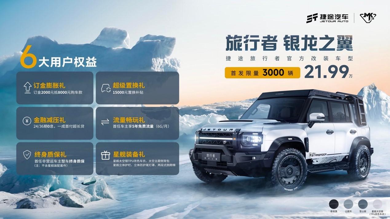 银龙之翼上市首发3000辆,售价21.99万元,提供订金膨胀、超级置换、金融减压、流量畅玩、终身质保、星舰装备6大用户权益,这款车型由捷途旗下的官方改装品牌JMK推出,JMK即JETOUR Makers Kingdom,今后捷途每一款重要的车型都会推出相应的JMK改装版。