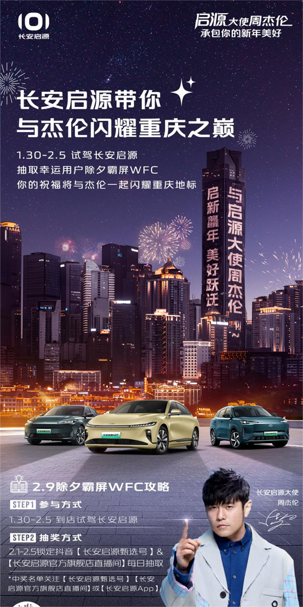 新年迎好运,启源送祝福。在甲辰龙年即将到来之际,长安启源携手启源大使周杰伦,在重庆之巅WFC,为长安启源粉丝及全网用户献上大型新春祝福“灯光秀”, 2月9日晚19:00-20:00,霸屏时刻,以祝福之名点亮重庆夜空,开启周杰伦、长安启源与粉丝的三向奔赴。