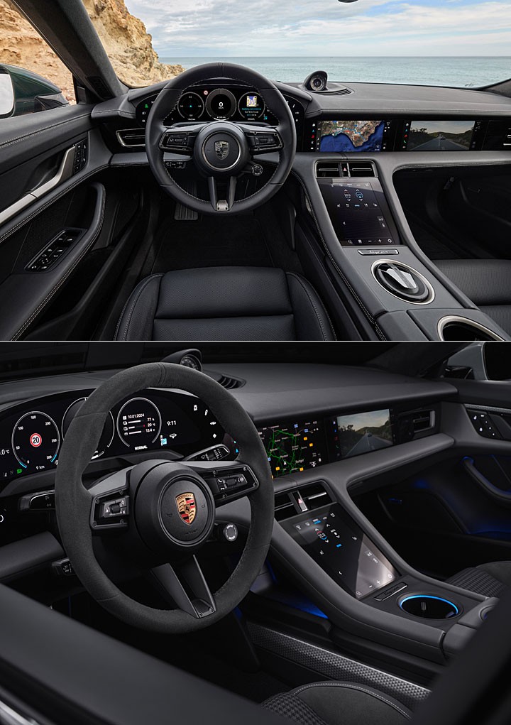 内饰部分,仪表板、中央荧幕与选配的乘客信息娱乐显示荧幕拥有丰富功能,并针对使用者界面进行升级,方向盘上的驾驭模式切换器新增列为标配,而配备跑车计时套件与高性能升级电池的 Taycan 车型,其在驾驭模式切换器上还增加独特的 Push-to-Pass 按钮;至于驾驶辅助系统可透过方向盘左后方的全新控制杆操作,使用更加直觉,Apple CarPlay 更加深入地整合在车辆的各个荧幕与功能之中,全新的车载影音功能可在中央荧幕与乘客信息娱乐显示荧幕上观看串流影音。