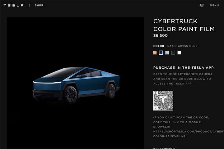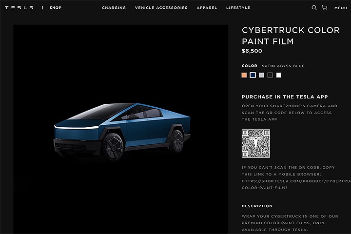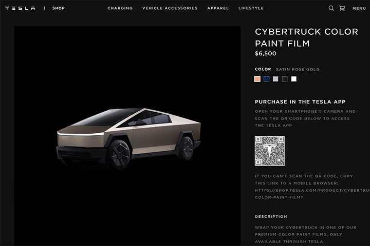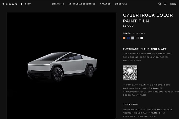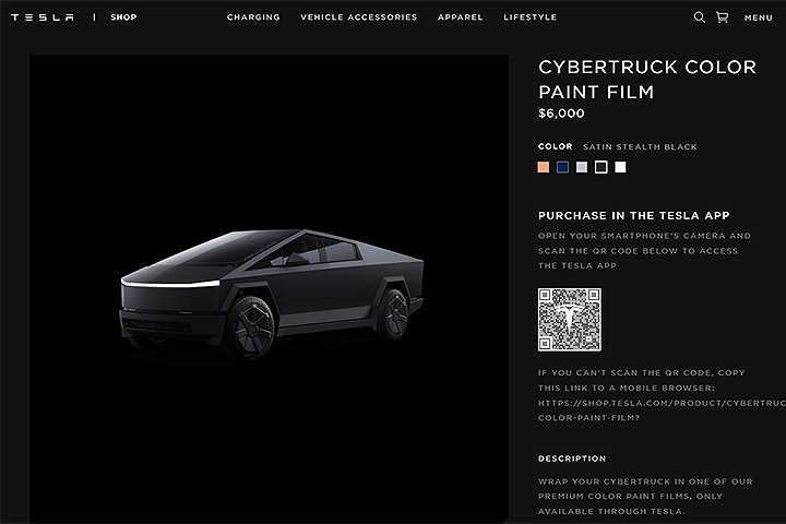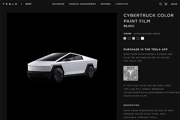 而 Cybertruck 在首批交付之初,先前也同步推出过 2 款「Cybertruck Color Paint Film」原厂贴膜服务,不过过去仅有 Satin Stealth Black 黑色、Satin Ceramic White 白色共 2 款贴膜可选,两者贴完全车的售价皆为 6,000 美金。