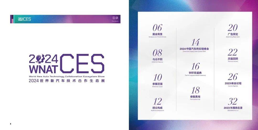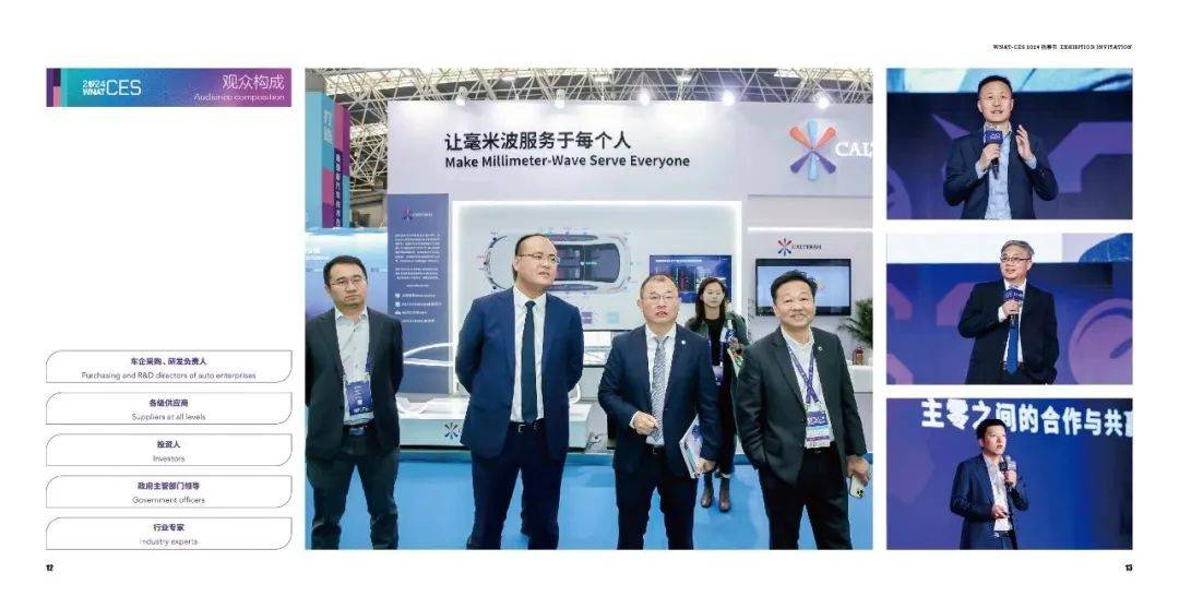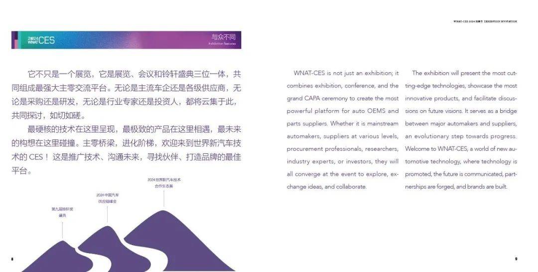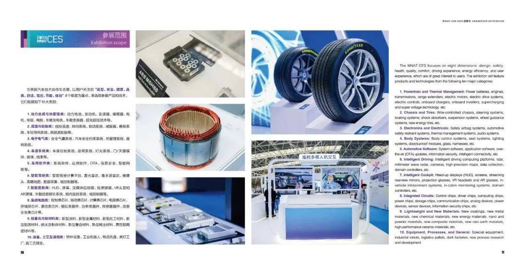 2024年,WNAT-CES以用户关注的“造型、安全、健康、品质、舒适、驾控、节能、体验”8个维度为重点选取参展产品和技术,将重点展示动力总成与热管理、底盘与轮胎、电子电气、车身系统、车用软件、智能驾驶、智能座舱、集成电路、轻量化与新材料、装备、工艺及通用10大类别,构建一个更加高效、精准且具有竞争力的新型汽车供应链展览。