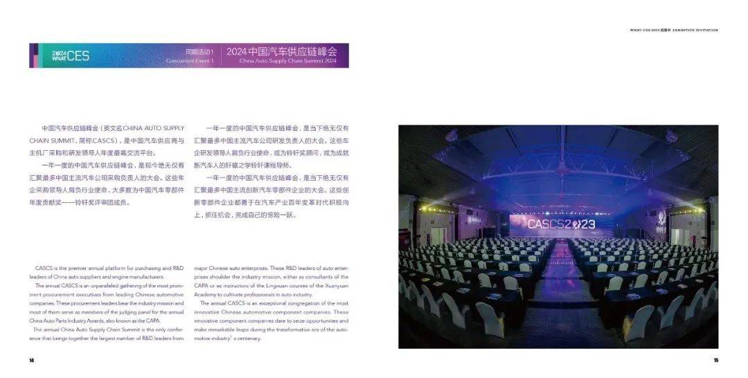 WNAT-CES不仅在展示范围规划上更加关注前沿,在同期活动的策划上也更加关注行业前端热点与痛点,注重引领全行业的创新与发展。2024年WNAT-CES展会期间将继续举办“2024中国汽车供应链峰会”、邀请主机厂、投融资机构、Tier1、科研院所等重要高管进行主题演讲。除主题演讲外,会议日程还将围绕展览范围进行多场的专题演讲,解读发展方向、交流技术创新、分享发展成果。