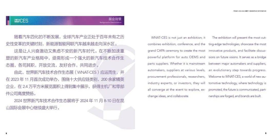 2023年的WNAT-CES给行业树立了多个风向标,比如汽车数字钥匙、大模型技术、车载芯片等产品,而作为2024年的第一场新汽车供应链领域盛会,世界新汽车技术合作生态展将进一步确定新汽车供应链风向,其所展示的新技术、新产品必将重新定义行业技术格局。共探商机,共谋发展,2024世界新汽车技术合作生态展招展全面启动,2024年11月8-10日在昆山国际会展中心,期待与您相聚盛会。