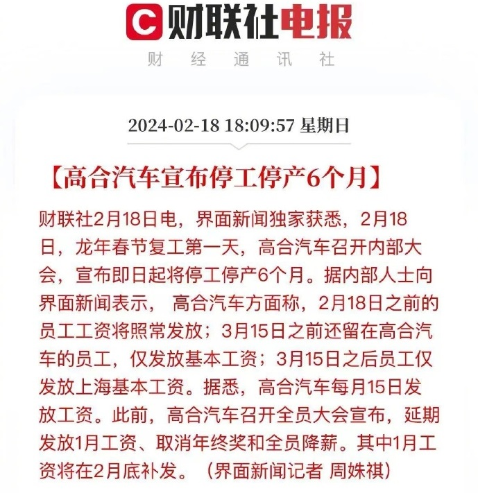 农历春节刚刚过去,汽车圈就发生了一件大事。2月18日,高合汽车召开了内部大会,宣布正式停工停产6个月。2月18日之前的员工工资将照常发放;3月15日之前还留在高合汽车的员工,仅发放基本工资;3月15日之后员工仅发放上海基本工资。而目前高合汽车的门店已经停止接收订单,可以说,如果没有意外的话,这个定位高端的造车新势力,就要成为历史洪流里的一员了。