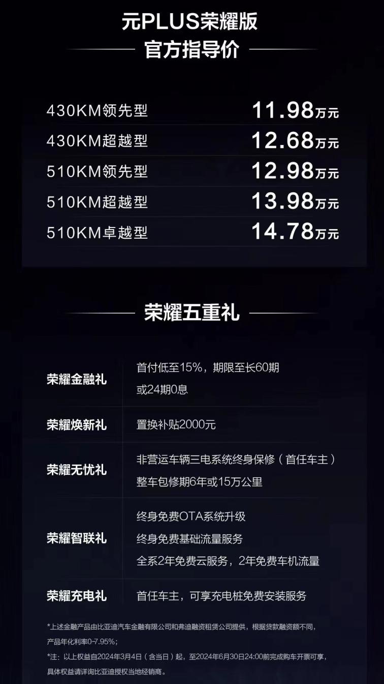 3月4日,元PLUS荣耀版正式上市,共5款车型,官方指导价11.98万元—14.78万元。此次,元PLUS荣耀版携颜值焕新、智能进阶压轴登场——全球首发黑骑士款外观内饰,同时升级智能语音连续通话,为元力青年、元气女生、活力家庭带来更高品质的纯电用车生活。