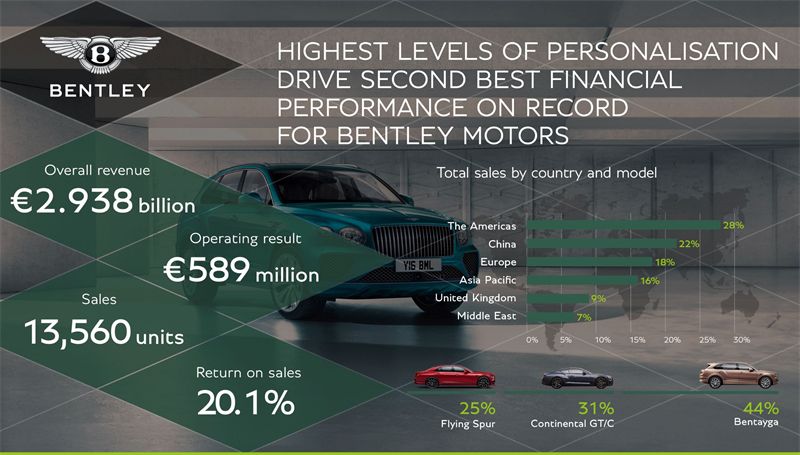 【车讯网 报道】 2024年3月19日,宾利汽车今日公布了2023年全球财务业绩,全年营业利润为5.89亿欧元。这主要得益于个性化定制服务的市场需求攀至新高,有四分之三的客户在宾利品牌提供的460亿种标准配置的搭配组合之外选择了由宾利汽车个性化定制部门MULLINER提供的定制化服务,这一需求较2022年同比增长43%。