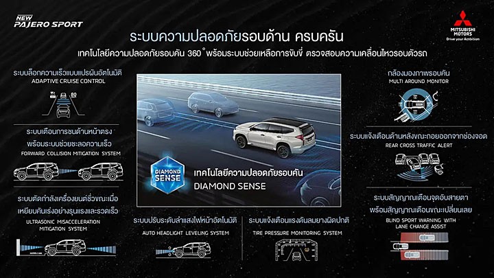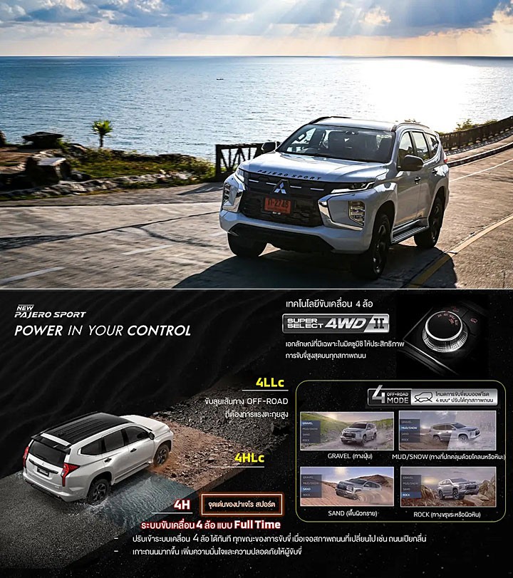 泰规 Pajero Sport 的 Prime 与 Ultra 车型仅提供 2WD 设定,至于 Elite 车型则有 2WD 和 4WD 不同选择,而 4WD 车型导入了 Super Select 4WD II 系统,除了能以全时 4H 状态行驶外,在高速状态下也能从 2H 切换至 4H,另外还配备了 4HLc 和 4LLc 以及 4 种越野模式,包括 Gravel 砂石路面、Mud/Snow 泥泞/雪地、Sand 沙地和 Rock 岩石地等;此外,泰规 Pajero Sport 也配备一系列完整辅助系统,包括 ACC 自适应巡航控制、FCM 前方碰撞缓解、UMS 误加速缓解系统、RCTA 后方交叉路口警示等等功能。