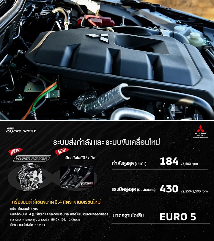 相比外观及内饰的更新与调整,动力系统的配置变动幅度就更加显著,小改款 Pajero Sport 采用 Hyper Power 代号 4N16 的 2.4 升柴油涡轮增压引擎,配备新一代电子共轨喷射,在 3,500 转时能产生最大 184 匹马力,而最大扭矩则来到 430牛.米,原厂强调新引擎能产生更低的二氧化碳排放并提高燃油效率,该组动力也配置在新世代 Triton 身上,不过马力和扭力数据因调校不同而有所差异,另外变速系统也从原先的 8 速自动,换成了 6 速自动变速箱。