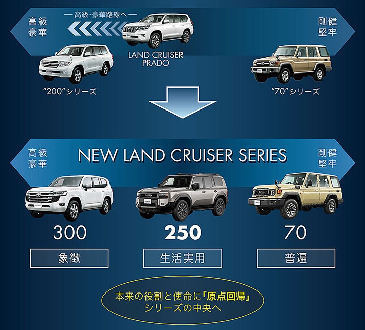丰田于 2023 年 8 月首度发表新世代 Land Cruiser 250 车系,可视为 Land Cruiser Prado 之后继车款,定位则在现行旗舰 Land Cruiser 300 车系之下。近期丰田则正式宣布 Land Cruiser 250 车系正式在日本上市。