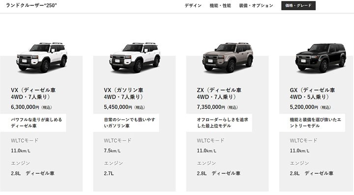 其中在车型编成部份,日规 Land Cruiser 250 车系提供汽油及柴油动力选择,其中搭载 2.7 升四缸汽油引擎车款提供 VX 单一等级配置,售价为 545 万日圆,折合人民币约26万元。配置 2.8 升柴油涡轮引擎的柴油车型,则具备 GX、VX 以及 ZX 三等级设定,售价分别为 520 万日圆、630 万日圆以及 735 万日圆。