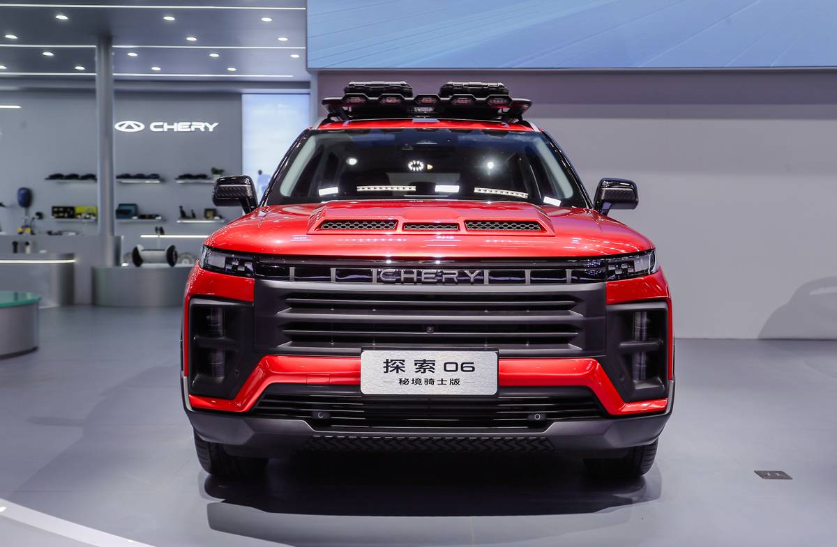 外观上,探索06 秘境骑士版一抹“中国红”,气场全开,6大造型全面升级,“最红”方盒子非它莫属。这是一台具有骑士精神的方盒子,采用全新前中网熏黑设计、全包覆式战甲前保、增加长空鳞甲进气组件、加宽加厚轮眉、车顶装载一体化行李架至高承重70kg、防爆灯组最大照射范围130m,车身后侧增加657*186*516mm侧窗战甲背包等,打造更硬派更越野的风格,全方位演绎骑士之姿。