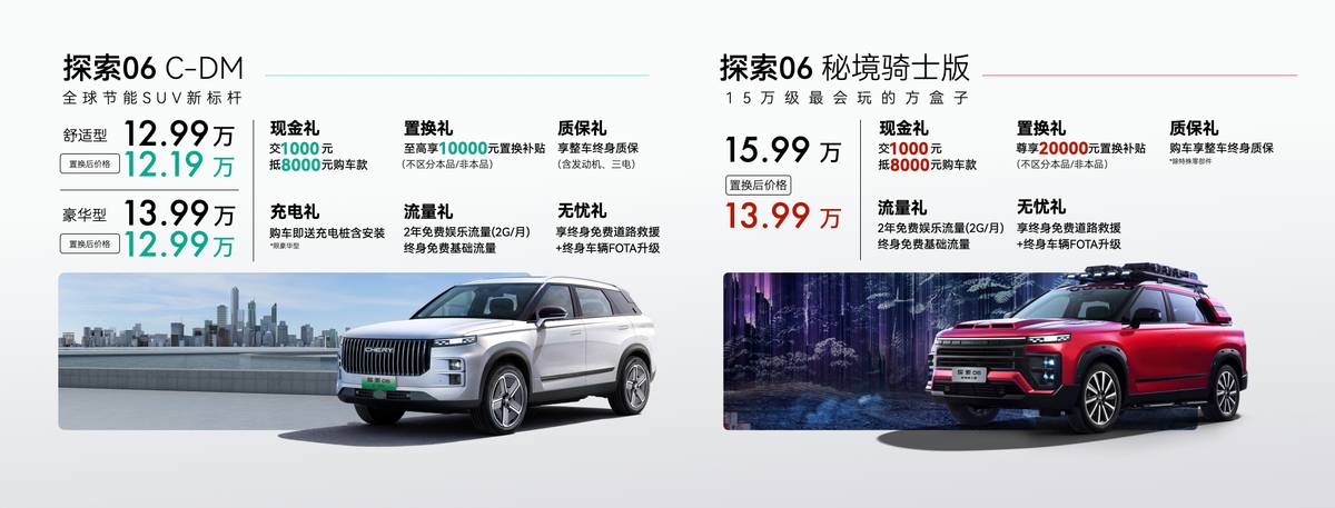 探索双星,电野来袭。4月25日,奇瑞汽车最年轻、最时尚的探索序列再出“燃油+混动”爆款CP,带来“可油可电”的探索06 C-DM,以及“可城可野可改”的探索06秘境骑士版。“全球节能SUV新标杆”探索06 C-DM推出舒适、豪华两款车型,官方指导价格12.99万-13.99万。奇瑞首款官方改装车、“15万级最会玩的方盒子”探索06秘境骑士版,官方指导价15.99万。为了让年轻人轻松实现梦想,购车还可享受多重惊喜福利。