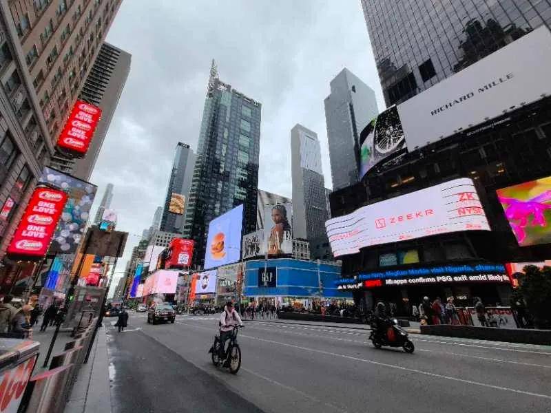 下午3时,纽约时代广场打出了一连串红色的极氪上市广告,在春寒料峭时节,分外引人注目。