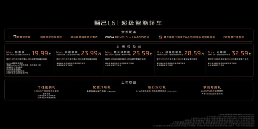 电池方面,新车将提供磷酸铁锂、三元锂和固态电池,CLTC续航里程分别为650、710km和850km。另外,智己L6还搭载了固态电池,容量为133kWh,CLTC纯电续航里程突破了1000km。
