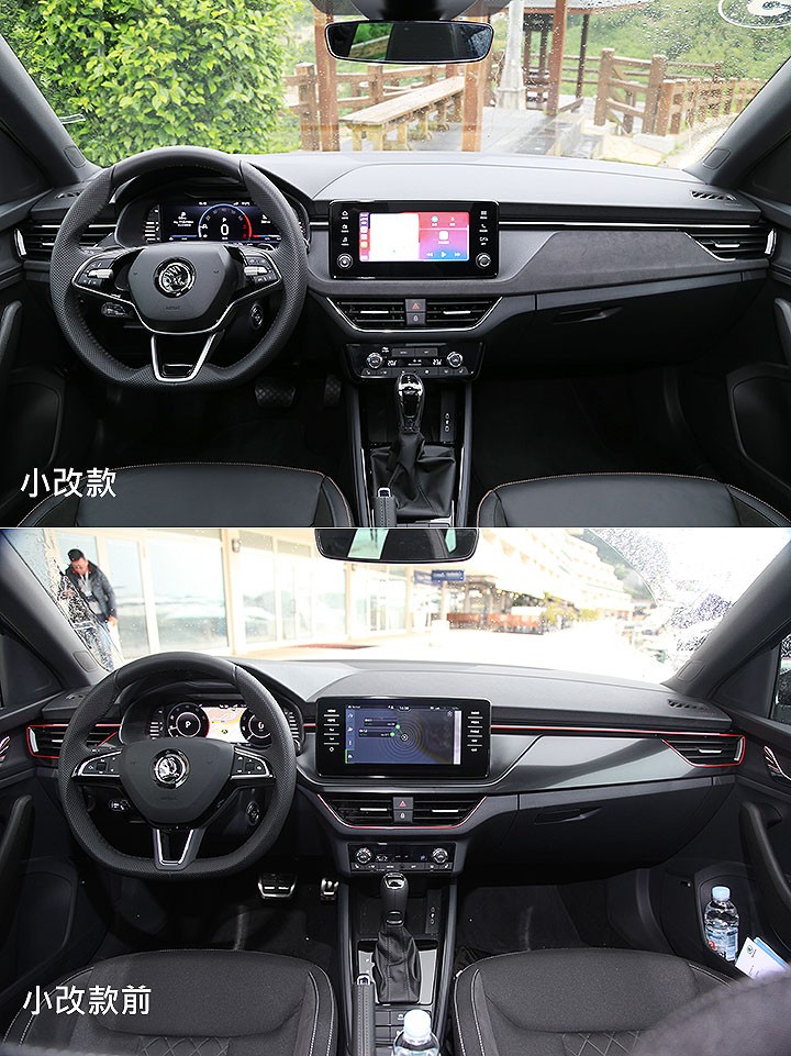 与外观造型上的幅度相同,小改款 Scala 驾驶座舱看过去会发现,整体陈设布局采用的是相仿格局,这一点从中控样式、手套箱上缘线条走势轻易能看出端倪,但虽然是相同格局,整体视觉效果却是相当不同,除了在小细节处的变化之外,最关键的,还是饰材用料上的变化与巧思,在视觉、触觉等感官上做出差异来。