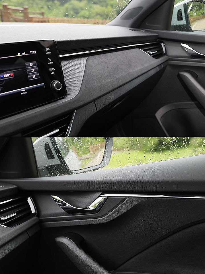 原厂在小改款 Scala 上导入了名为 Suedia 的材质,这种材质触觉上质感就如同麂皮一般,在前台总成、车门内侧饰板等处都大量运用,不但大幅降低塑料感,视觉上也更突显层次丰富,搭配 10.25 吋数位仪表、8.25 吋触控荧幕,驾驶座舱质感提升不在话下;Suedia 材质也同样运用在座椅设计上,与真皮混搭并加上橘色滚边车缝线,增添了些许运动感。