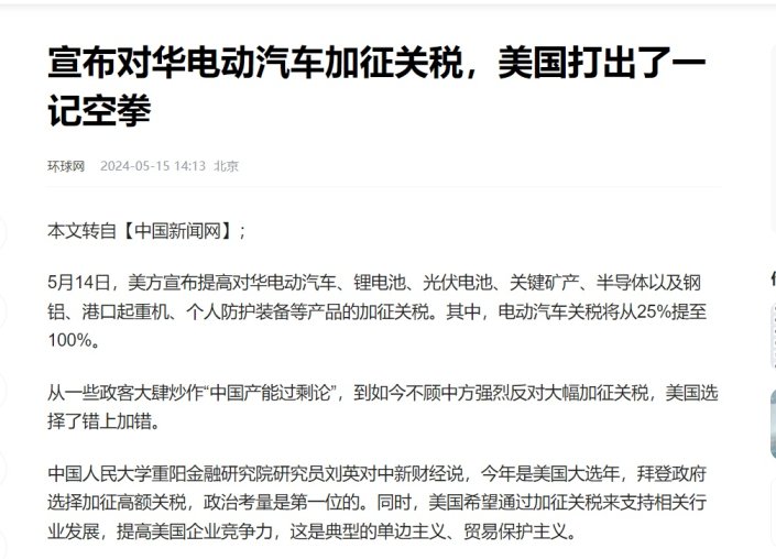 (图为:《环球时报》关于针对中国新能源汽车关税的报道)