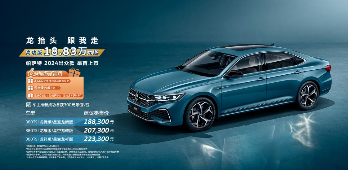 4月底,恰逢国家推出汽车以旧换新政策,为了更好回馈广大用户,帕萨特也在第一时间送出超值大礼包,出众款不仅能享受超值价格,还能获得以旧换新国家补贴至高7,000元、大众补贴至高6,000元等丰厚好礼。为满足广大消费者的购车需求,帕萨特6月继续推出6,000元置换或本品增购补贴、现金保养券二选一、至低0首付、至低0月供、至高5年0利率、车主推新成功各获300元等值V豆等多重福利。详情请洽当地经销商。