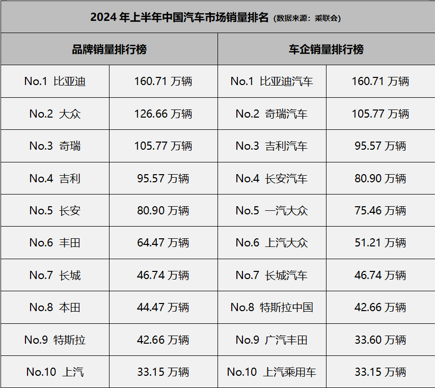 通过乘联会统计的数据我们可以看到,在今年上半年,比亚迪无论是企业销量,还是单一品牌销量,都位居第一。这组看似“繁杂”的统计数据,其实透露出了很多有意思的信息。
