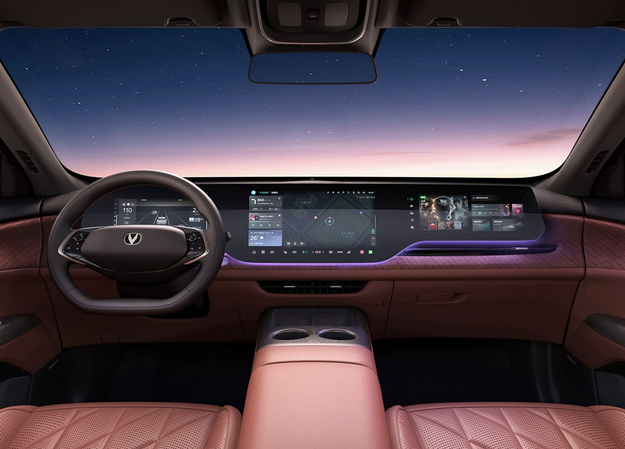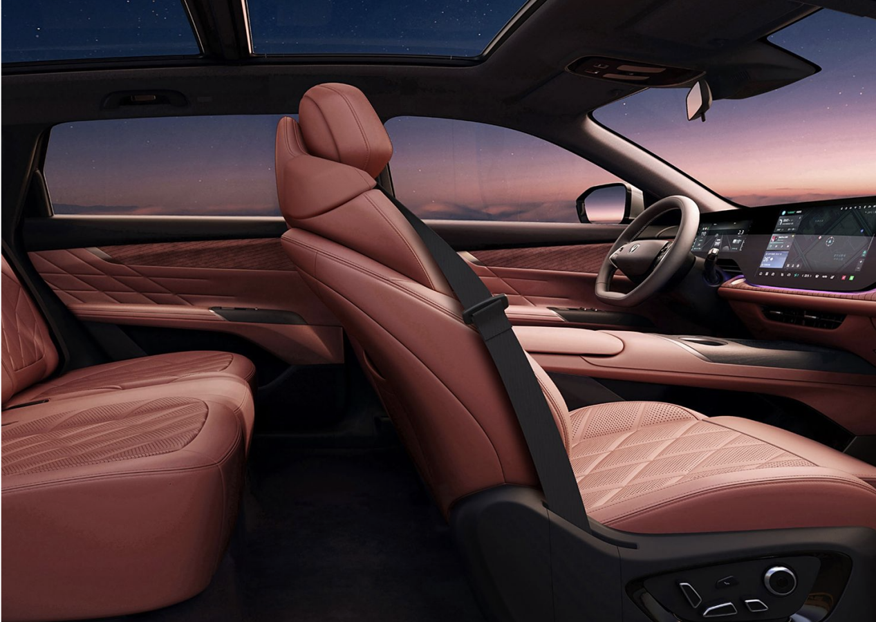 内饰方面,新车配备了双幅式多功能方向盘,搭载由10.25英寸全液晶仪表+14.6英寸中控屏+12.3英寸副驾娱乐屏组成的悬浮三联屏的设计,并在下方位置加入了氛围灯带进行点缀,匹配了怀挡及拥有通风、加热、按摩、大角度放平等功能的零重力座椅,新车整体的内饰设计具备一定的豪华感与科技气息。此外,新车推出的内饰配色分别有:神秘红、幕夜黑热浪橙以及烟波棕。