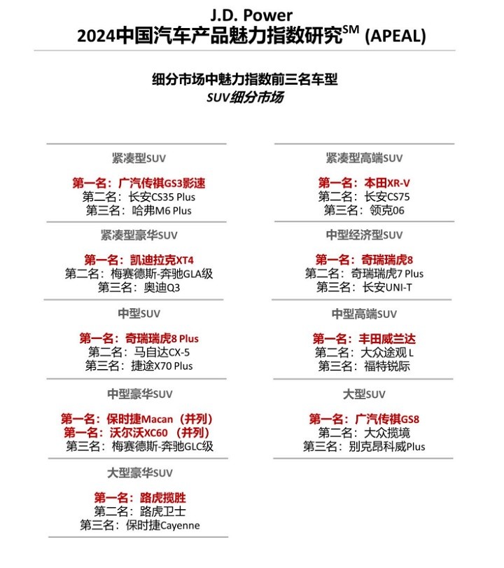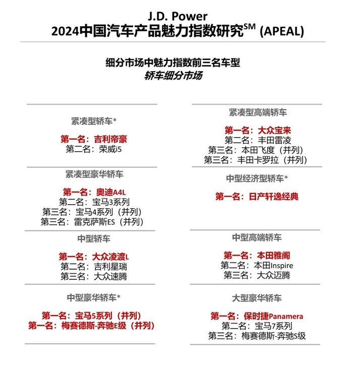 中国 J.D.Power 所公布的 2024 APEAL 新车魅力调查结果,是基于 2023 年 6 月至 2024 年 3 月期间购买新车的 32,728 位传统燃油车车主评价,并涵盖 48 个品牌的 221 款车型,虽然是以燃油车车主调查为主,但是其也提供了中国新能源汽车产品魅力指数研究 SM ( NEV-APEAL ) ,衡量新能源汽车车主对于产品魅力的满意度来做参考和比较;同时调查的的类别共有外观造型、设置和启动、上/下车、车身内饰、车辆性能、驾驶感受、安全感、车载信息娱乐系统、驾乘舒适性以及燃油经济性共计 10 大项。