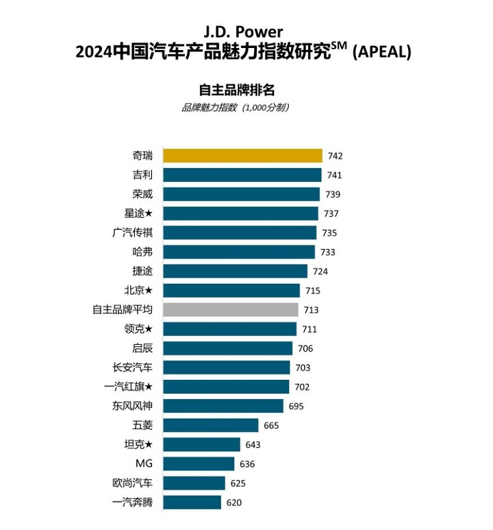 至于看到自主品牌部分,奇瑞以 742 分险胜吉利的 741 分,排在第 3 的则为荣威,而MG却不太受消费者青睐,仅获得 636 分、在排行榜中落在倒数第 3。