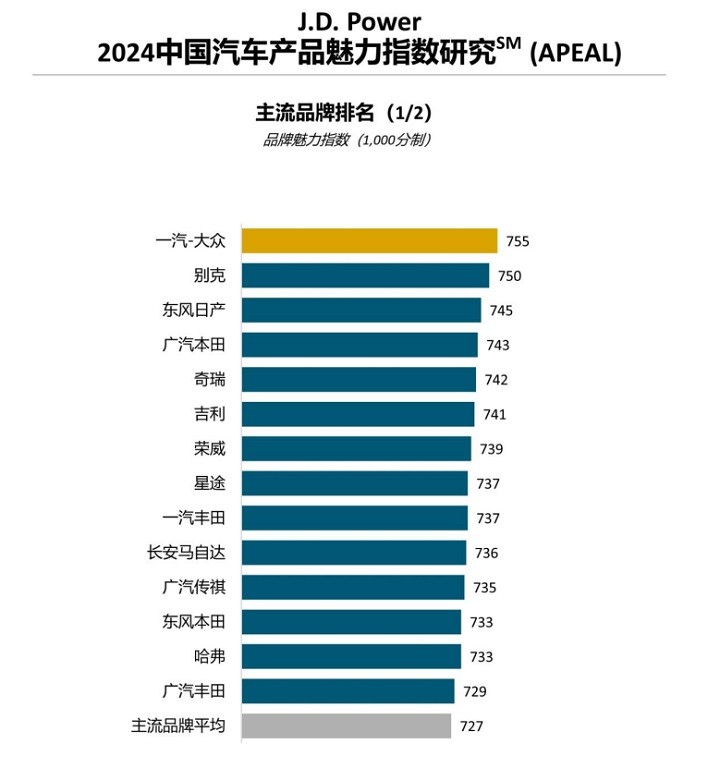 至于在一般品牌部分,由一汽大众以 755 分拿下冠军,不过一汽大众里不仅只有大众,奥迪、捷达等等也都在内,至于排在第 2 的则为别克、第 3 为东风日产,至于广汽本田虽然排在第 4,但东风本田却排名在 12,而一汽丰田与广汽丰田分别落居第 9 与 14,显现丰田魅力度并未很突出。