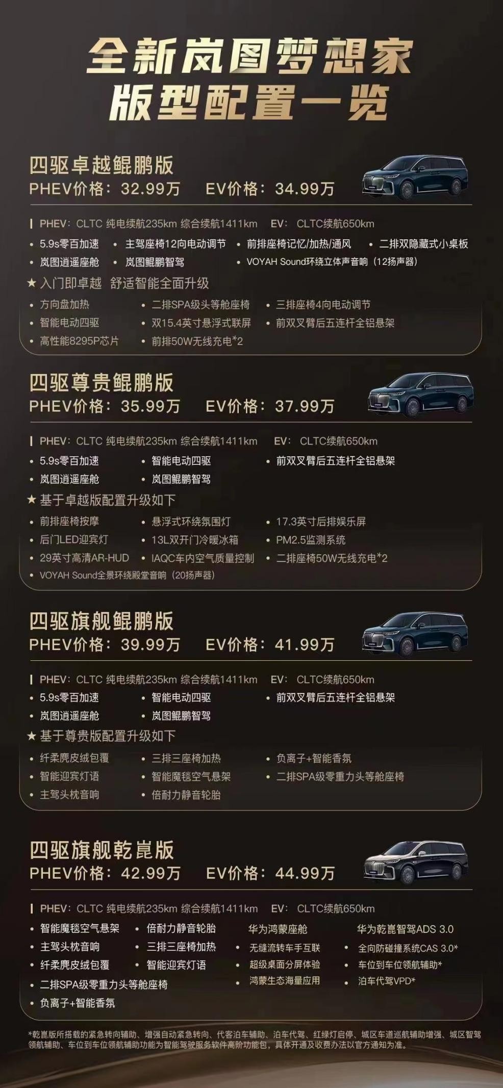 日前,东风汽车旗下豪华旗舰7座中大型MPV全新岚图梦想家正式上市,新车共推出8款配置车型,售价区间32.99-44.99万元。鲲鹏版即日起交付,乾崑版预计于11月开始交付。新车在外观、内饰及配置方面都进行了全面升级,同时搭载了华为目前最新的乾崑ADS 3.0智驾系统,配备192线激光雷达。