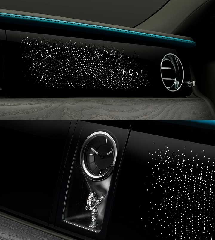 座舱内,小改款 Ghost Series II 车系则是更为强调「自驾适性」,除了可以让准车主依照个人喜好去订制数位仪表的配色,且在镶于中控台内的时钟下方,设计了可展示欢庆女神的橱窗,且副驾驶前方提供了星空仪表的选配。