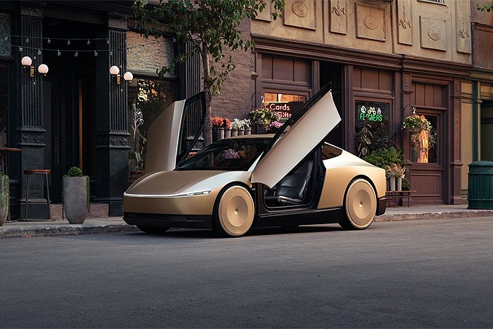 如今 Robotaxi 实车登场后,其正式命名更改为「Cybercab」,外观上一如先前 Elon Musk 在自传揭示的设计轮廓皆示,Cybercab 采用左右上掀式的欧翼车门、并没有后车门的设定,外观则具有类似 Cybertruck 的前卫设计风格,其整合现行特斯拉 Model 3 与有着一如子弹列车般的锐利车头设计,搭配车身藉由钣件摺线呈现类似 Cybertruck 电动皮卡的前卫视觉,车尾部则以流线方式向下收束。