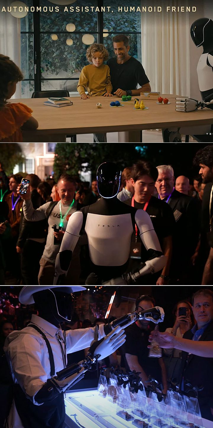除了最受瞩目的 Robotaxi 车款 Cybercab 之外,特斯拉 在今日活动也意外亮相无人驾驶巴士 Robovan,其车内有着可容纳 20 人的空间、或是能容纳大型货物,外观亦采用 Cybercab 的风格。而活动中另外亮相的新一代 Optimus 智慧机器人,则除了演示未来能成为家庭中料理食物、搬运物品等事务的好帮手外,更能担任酒吧服务员等工作,甚至活动现场更直接演示其展现舞蹈、能与宾客互动、发送伴手礼的能力,不过细节部分 Elon Musk 并未透露太多,仅指出其量产成本约落在美金 2 至 3 万。