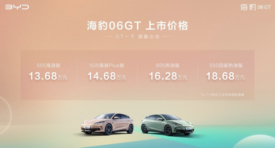 近日,天天汽车获悉, 比亚迪海豹06GT正式上市。推出4款车型,售价为13.68-18.68万元。据了解,新车基于比亚迪e平台3.0 Evo打造而成,推出单电机后驱及双电机四驱版车型。