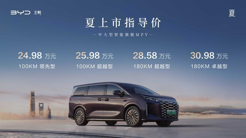 作为比亚迪王朝网第六大IP的首款同名MPV,夏为中国品质家庭而来,全系标配5R12V“天神之眼”DiPilot 100高阶智能驾驶辅助系统,开启MPV智驾新风尚,搭载第五代DM技术,基于新一代插混整车平台打造,符合新版 C-NCAP五星安全、C-IASI优秀双重高安全标准设计,采用华夏龙颜美学和王朝新一代内饰设计语言,拥有宽奢百变大空间、豪华科技智享座舱,实现智驾、技术、平台、安全、设计、空间、智享七大引领,全面引领中大型豪华插混MPV新趋势。