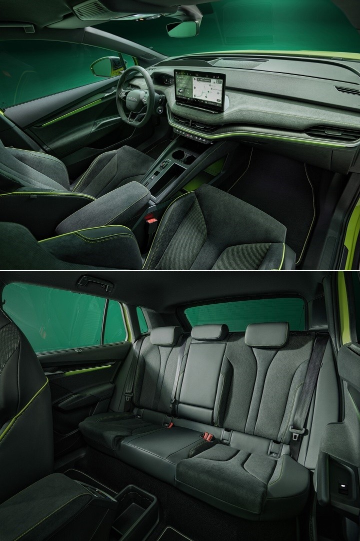 进入到车内,Elroq RS 采用的是 Suedia 超细纤维内饰,搭配上石灰绿色的对比缝线以及仿碳纤维饰版,三幅式方向盘使用上穿孔皮革的设计,驾驶座具备电动调整功能,并标配按摩和记忆等功能,不过副驾驶座则需选配 Maxx 套件才能拥有。Elroq RS 同样搭载 5 吋数位仪表和 13 吋中央信息娱乐系统,并提供 4 个 USB-C 充电孔,输出最高功率可达 45W,并且也具备手机无线充电功能;后车箱标准容积同样为 470 公升,并且可扩充至最大 1,580 公升。