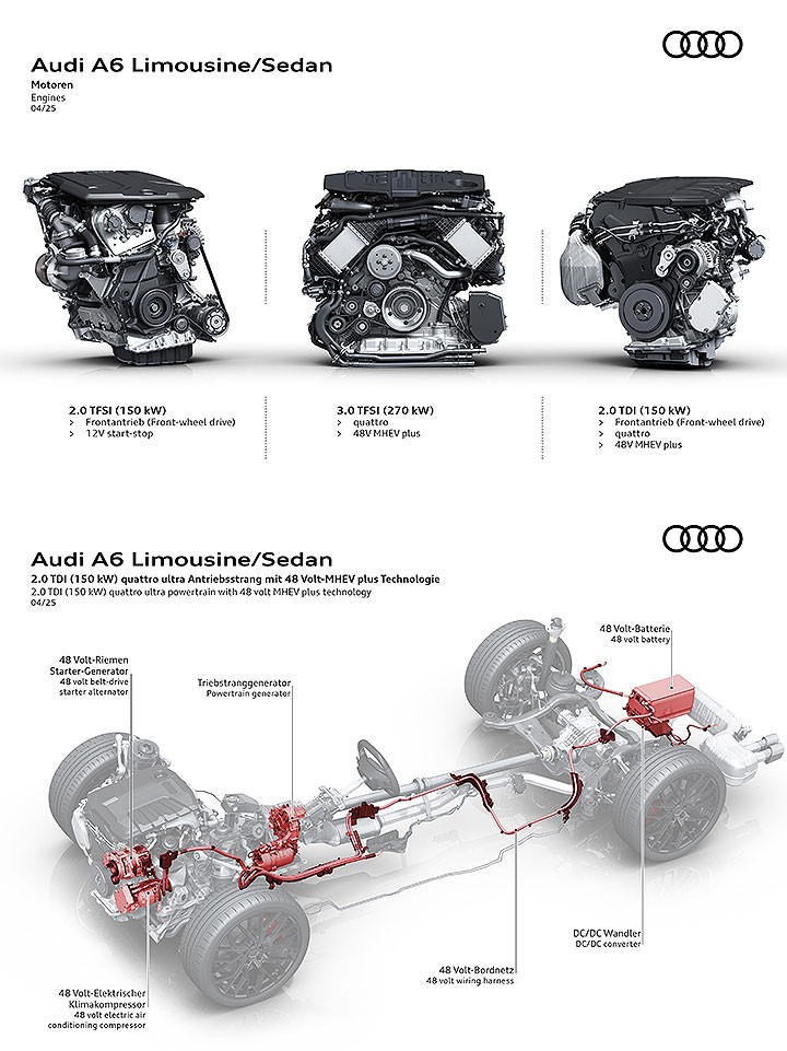 动力配置也与先前 A6 Avant 首波公布的设定相同,分别是 2.0 TFSI、3.0 TFSI quattro 两种汽油引擎,以及 2.0 TDI 的柴油动力选择,前驱的 2.0 TFSI 动力数据为 204 匹 (150kW) 与 340牛.米,从静止加速到时速 100 公里需时 8.2 秒。2.0 TDI 车型提供有前驱与四驱两种设定,动力数据皆为 204 匹 (150kW) 与 400牛.米,加速表现则是 7.8 秒 (前驱)、6.9 秒 (四驱)。