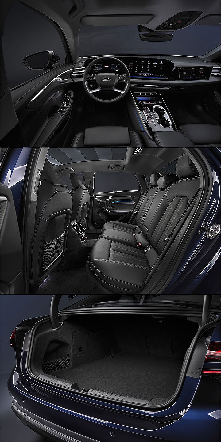以轿车版本来看,A6 e-tron 车身轮廓线条在车尾处的走势,更象是 Sportback 的斜背设计,而新世代 A6 则还是如同传统轿车一般,在车尾行李厢处有着较为平整的线条设计;A6 车身长度为 4,990mm、车宽 1,880mm,轴距则是 2,927mm,相比前代长度增加了 60mm,意味着空间更加放大,原厂公布数据显示,A6 车尾行李厢基础容积为 492 公升,后排座椅为 4/2/4 可翻摺倾倒设计。
