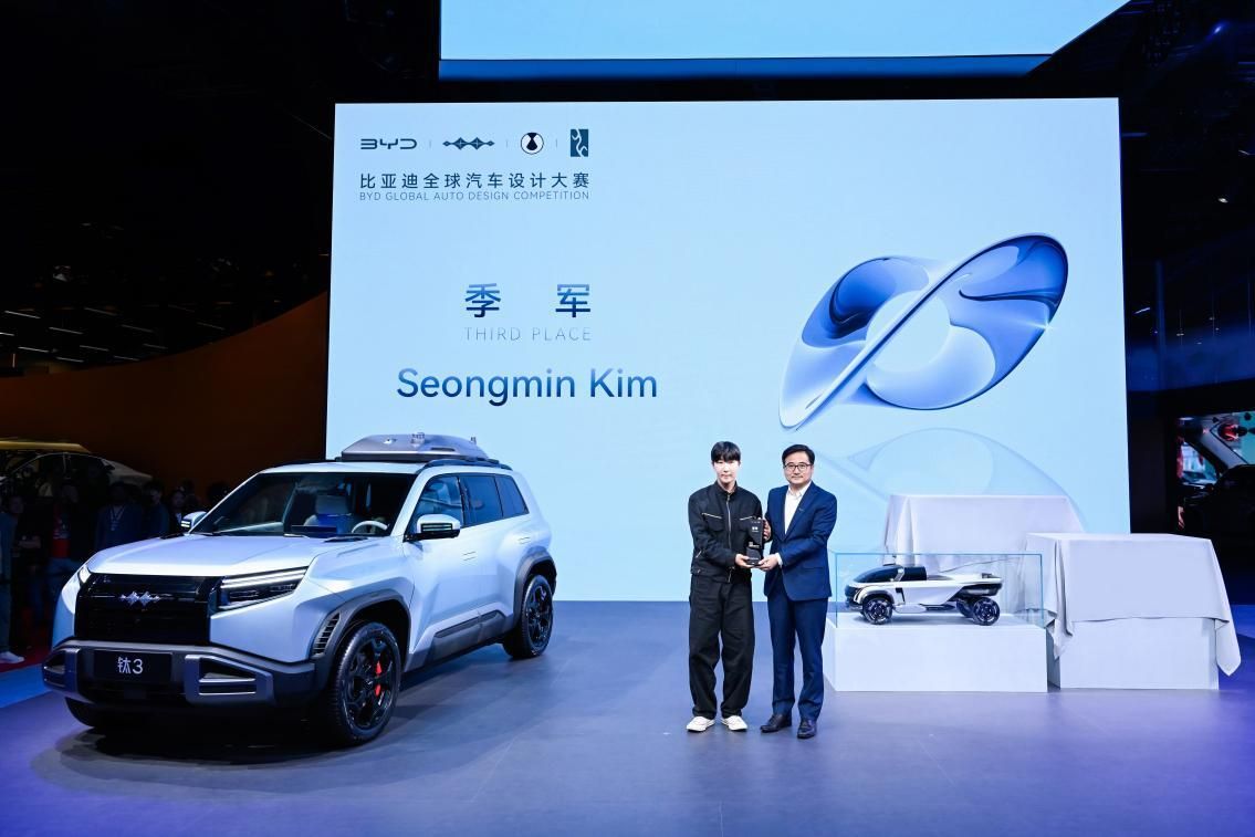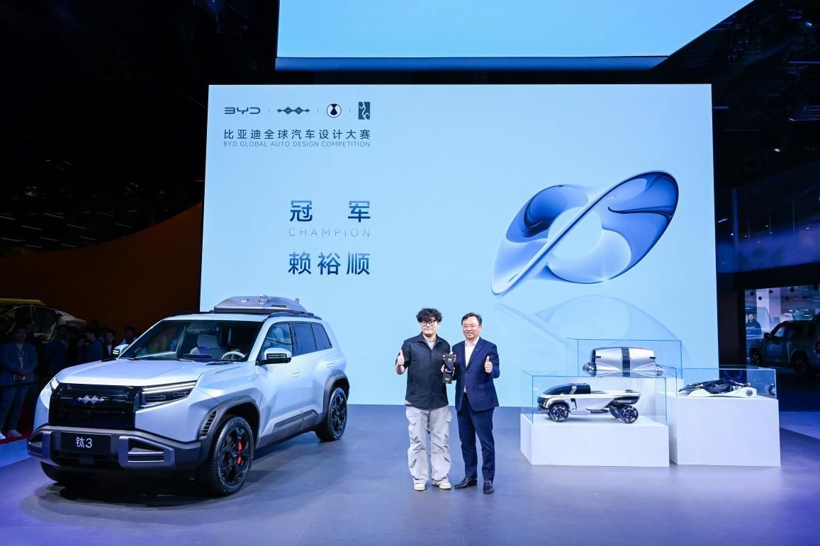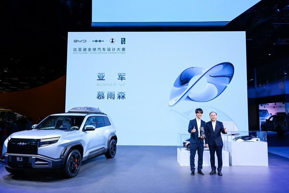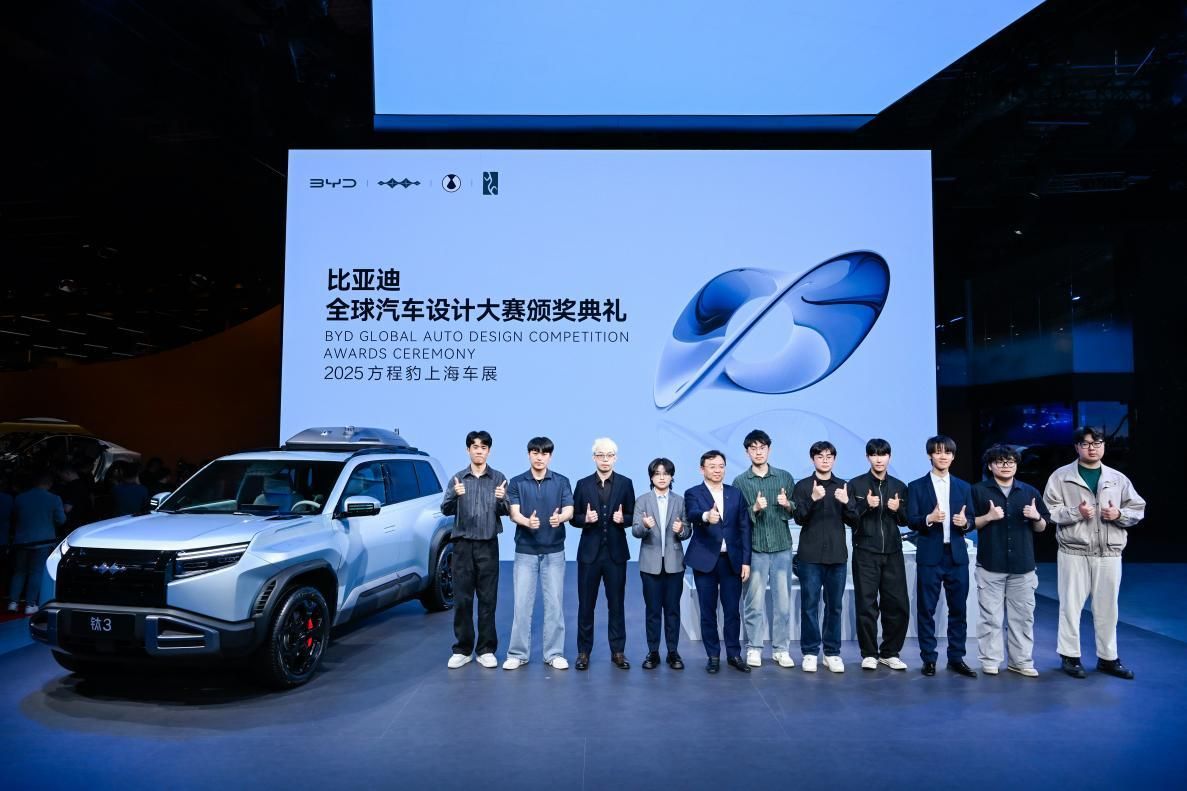 2025年4月23日,比亚迪全球汽车设计大赛颁奖典礼于上海国际车展方程豹展区盛大启幕。来自清华大学美术学院、中央美术学院等五大顶级艺术院校的专家评委亲临颁奖典礼现场。比亚迪王传福总裁为来自天津美术学院的冠军选手赖裕顺颁奖。