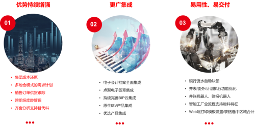 更广集成:致力于系统间互联互通。电子会计档案集成助力财务数字化、点聚电子签章集成完善签署流程、持续完善 BIP 云、原生 ISV 及优选产品集成……