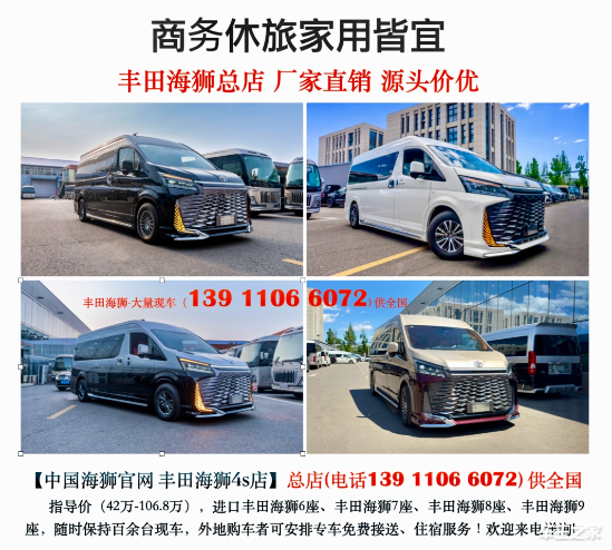 丰田海狮4s店现车139 1106 6072 汤总(同微信)丰田海狮金融政策:首付20%,3年0息,企业用户专享。丰田海狮总店外观颜色:白色、金色、黑色 内饰颜色:白色、米色、黑色、红色、棕色 厂家直销!全国上牌!丰田海狮4s店微信电话:139 1106 6072 汤总(同微信)