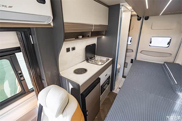 厨房区位于车身右侧,得益于整体布局和多处抽拉式设计,一体式橱柜几乎从副驾驶后方延伸到尾部床铺处,操作空间宽敞。台面采用推拉式延伸设计,可根据烹饪需求灵活拓展。厨房配备抽拉式电磁炉、带盖铝合金洗菜池、多个抽拉柜、烤烘一体微波炉以及102L双开门冰箱,满足各种烹饪需求和食材储存需求,即便在旅途中也能轻松烹制美味佳肴,享受家的味道 。