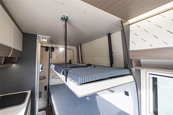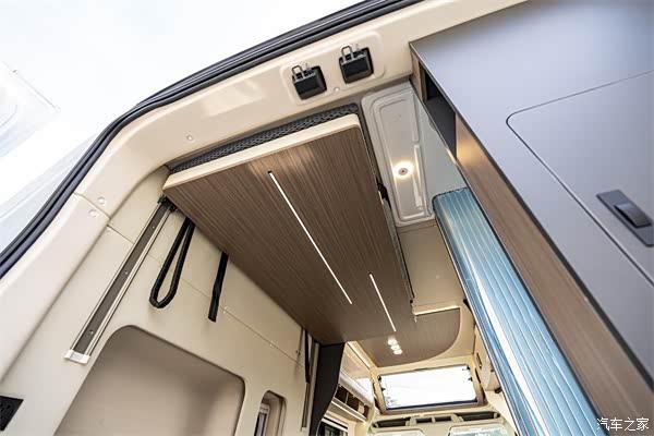 尾部休息区采用可变纵床设计,平常收起空出过道,方便车内人员走动;床板放下后床铺尺寸为1850×1300mm,两侧均做外扩处理,宽敞舒适,可轻松满足两人安稳休息。床板下方两侧都有储物空间,方便存放物品;上方是储物吊柜,进一步增加车内储物能力。此外,休息区还配备阅读灯等设施,提供舒适休息环境 。