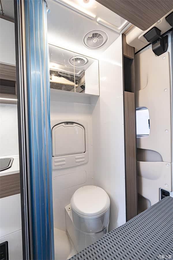 卫浴间采用抽拉扩展设计,不使用时节省空间,使用时拉出,内部空间规整。设施齐全,包括马桶、洗手池、抽拉式水龙头、换气扇等,虽空间有限,但能满足日常如厕、洗浴需求。同时采用防水、除臭、防霉变设计,保持内部环境清洁与舒适 。